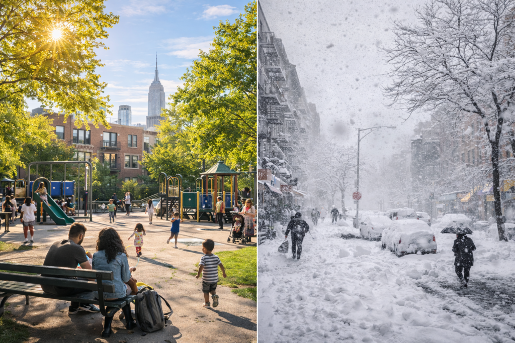 NYC experiences all four seasons with genuine intensity. Summers are hot and brutally humid July and August temperatures regularly hit 88–95°F with humidity that makes it feel like 100°F+. Air conditioning is non-negotiable from June through September, which spikes electricity bills. Winters are cold and unpredictable: January averages 32–38°F, with snowstorms delivering 6–18 inches multiple times per winter. Spring and fall are genuinely beautiful. Hurricane season (June–November) occasionally sends major storms (Hurricane Sandy in 2012 caused $19 billion in damage to the NYC area), and the city’s flood infrastructure is still being rebuilt.